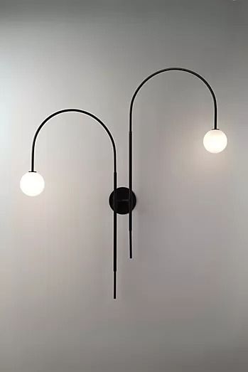 This contemporary wall light showcases two elegant, arched arms extending from a central mount, each ending with a glowing white globe. The sleek black metal frame contrasts beautifully with the soft illumination, creating a graceful and modern look. Ideal for hallways, bedrooms, or living rooms seeking a touch of elegance through minimalist design.