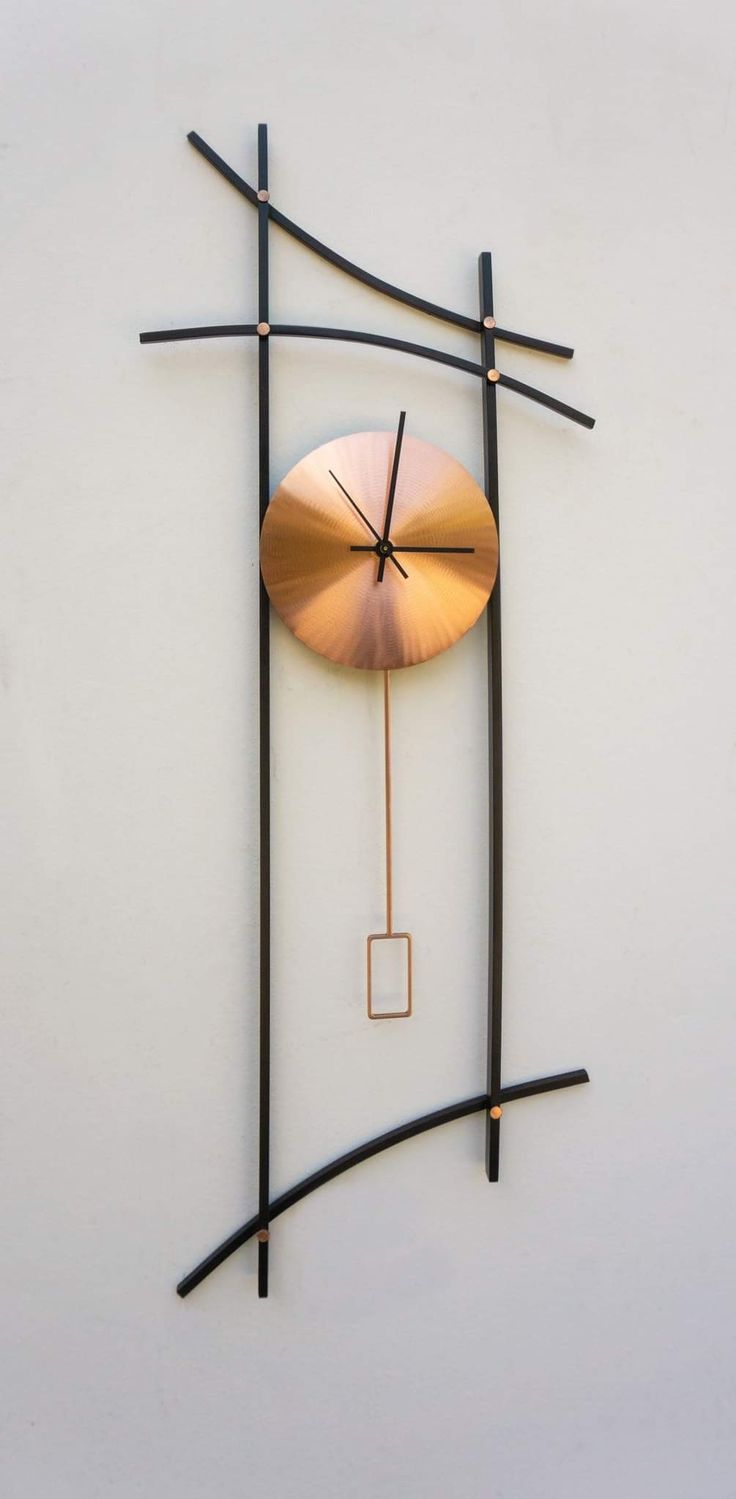 This contemporary wall clock features a stunning golden circular face with black hands for a bold contrast. Its unique black metal frame incorporates curved and straight lines, creating an abstract and modern design that complements any modern or minimalist interior. The added pendulum element enhances its elegance, making it a perfect decor piece for homes, offices, or creative spaces.