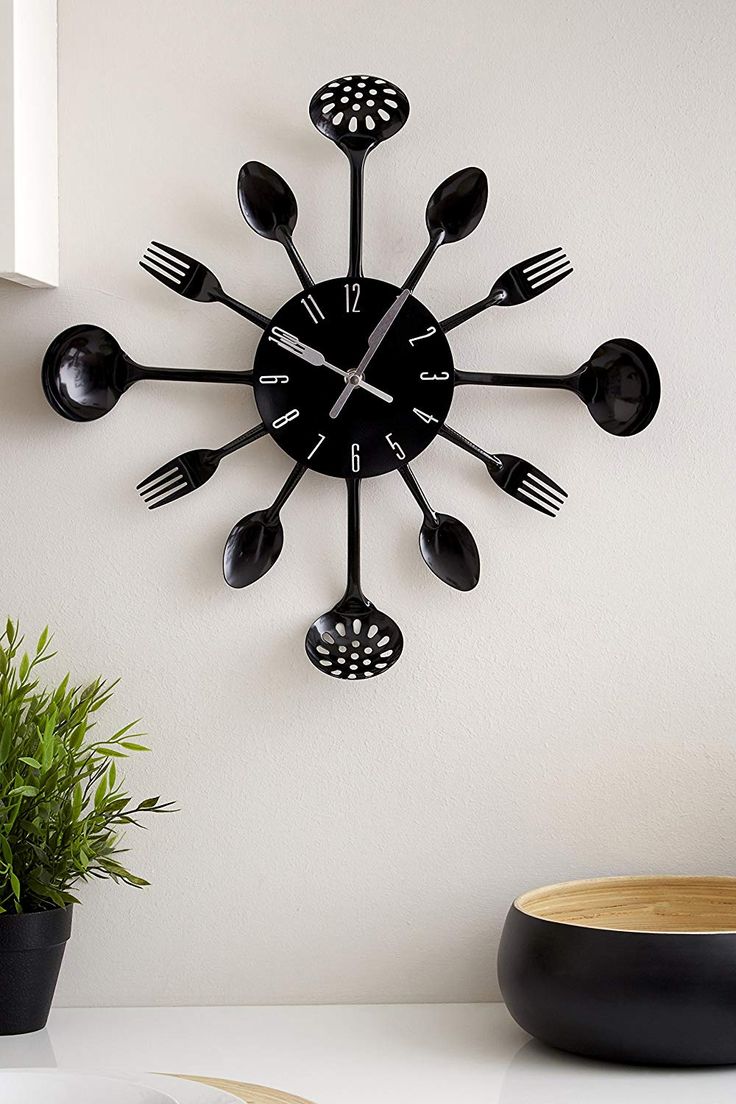 A quirky kitchen decor piece with spoons and forks forming the clock frame.