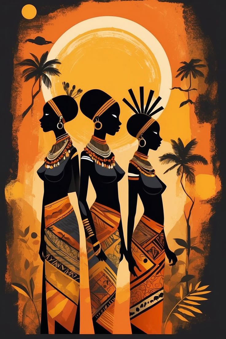 This vibrant illustration showcases three graceful African women dressed in patterned wraps and traditional jewelry, standing against the backdrop of a radiant sun. Their elegant postures and unique hairstyles highlight individuality and shared heritage. Framed by silhouettes of palm trees and a textured orange gradient, the image radiates warmth, strength, and ancestral connection.