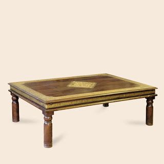This traditional Indian coffee table is a beautifully crafted piece of furniture made from rich hardwood. Its standout features include delicately turned legs and a smooth rectangular surface framed with ornate brass inlay, including a central brass motif that adds a touch of regal elegance. The fusion of wood and metalwork highlights the expert craftsmanship and cultural artistry associated with Indian furniture-making. Ideal for living rooms or cultural-themed interiors, this piece brings warmth, heritage, and character into any space.