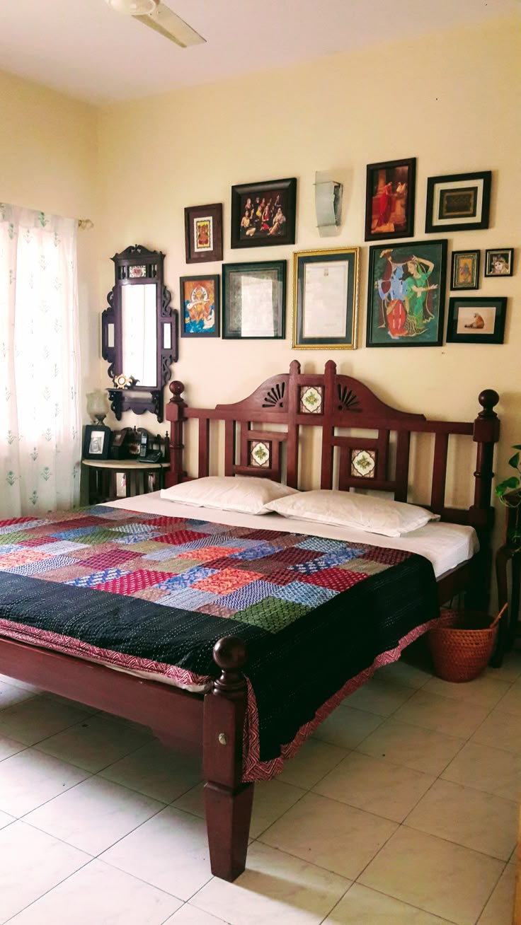 It showcases a classic Indian bedroom featuring a beautifully carved wooden bed with a high headboard, accented with hand-painted ceramic tile inlays. The bed is dressed with a colorful patchwork quilt that adds a cozy and personal touch to the room. On one side, a vintage-style mirror and compact wooden table hold essentials and decor. The wall behind the bed is adorned with a curated gallery of framed artwork and photographs, creating a vibrant and lived-in atmosphere. The soft natural light filtering through the white curtains enhances the warm tones of the wooden furniture, offering a perfect blend of tradition, art, and comfort.